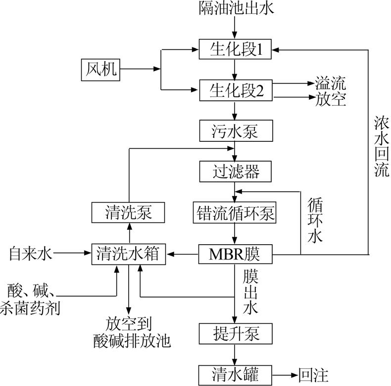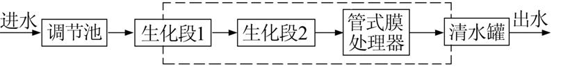圖 1中回注水處理工藝流程中虛線部分為車載部分。工藝流程重點(diǎn)對工藝流程生化段1、生化段2、管式膜處理器詳細(xì)說明〔2, 3, 4〕,具體工藝流程見圖 2。